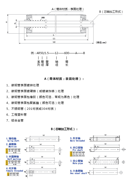 輥筒直徑D 軸徑d 壁厚t 長度L 筒體材料 表面處理
